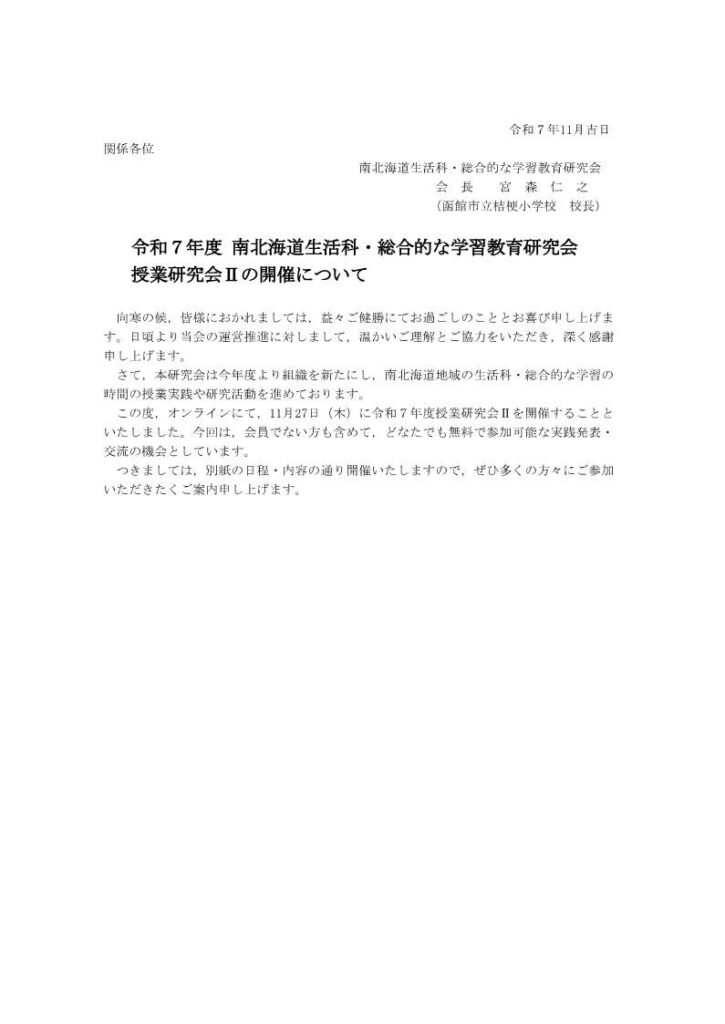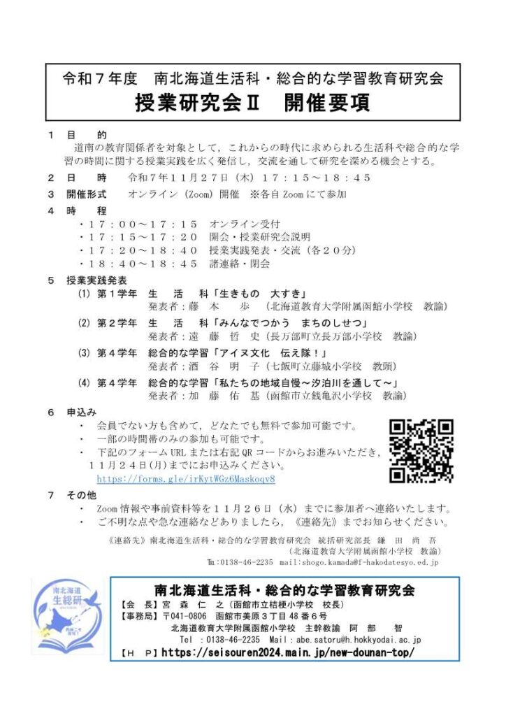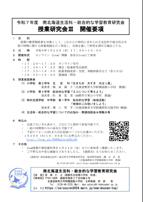 この度、R7 2月15日(土)9:00より冬季研究会を開催いたします。北海道教育大学附属函館小学校を会場といたしましてオンライン併用で開催する予定です。