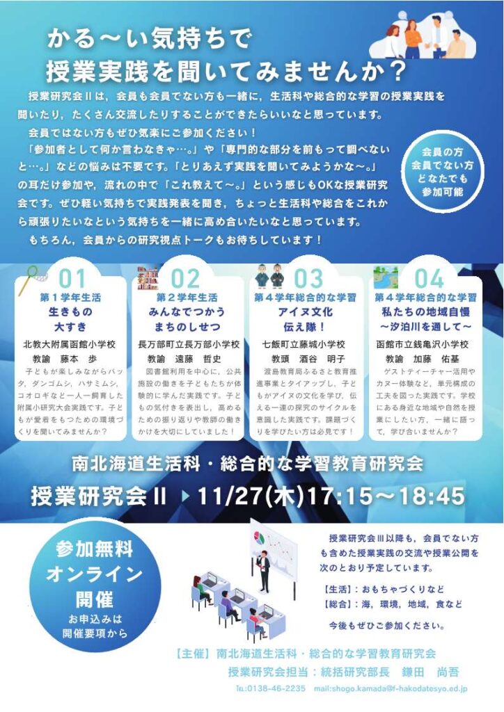 11月27日の17:15分~18:45に授業研究会Ⅱが行われます。生活科と総合的な学習の時間のそれぞれの実践を2本ずつ紹介致します。