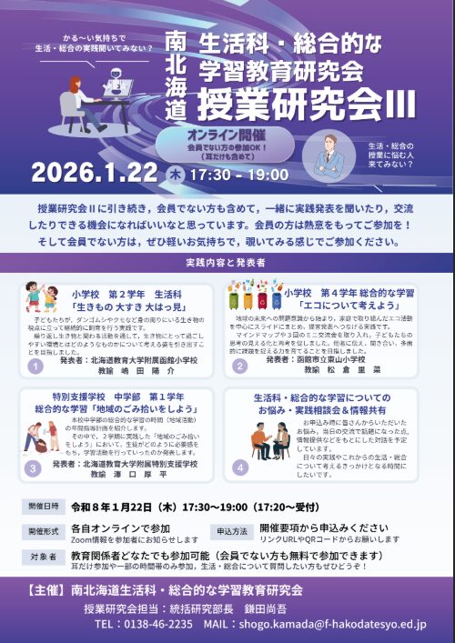 南北海道の会員のみならず、多くの先生方と生活科・総合的な学習を学ぶ時間にできればと思います!!ご参加お待ちしております!!