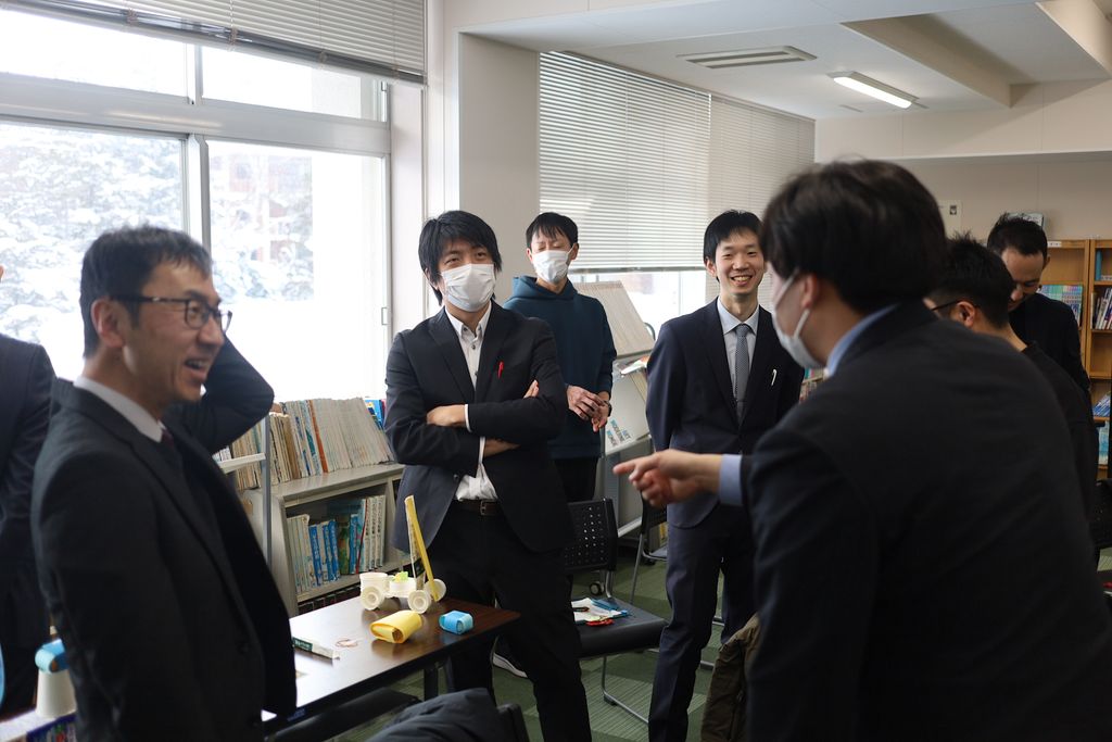 具体的には、2学年生活科の題材「うごけ うごけ わたしのおもちゃ」を、参加者が児童となって体験しました。遠藤教諭(教師役)の指示のもと、おもちゃ作りが始まると、会場のあちこちで探究的な姿が見られました。