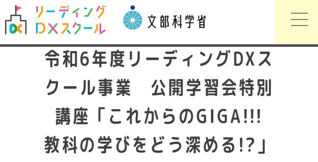 リーディングDXスクール事業 公開学習会の特別講座のご案内です。「これからのGIGA!!! 教科の学びをどう深める!?」をテーマに、文部科学省主任視学官 田村 …