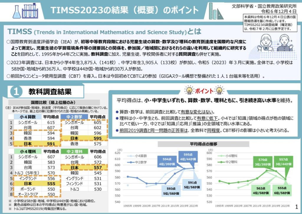 【読売新聞オンライン記事引用】 世界の小中学生を対象に算数・数学、理科の学力を測る2023年の「国際数学・理科教育動向調査(TIMSS(ティムズ))」で、日本…