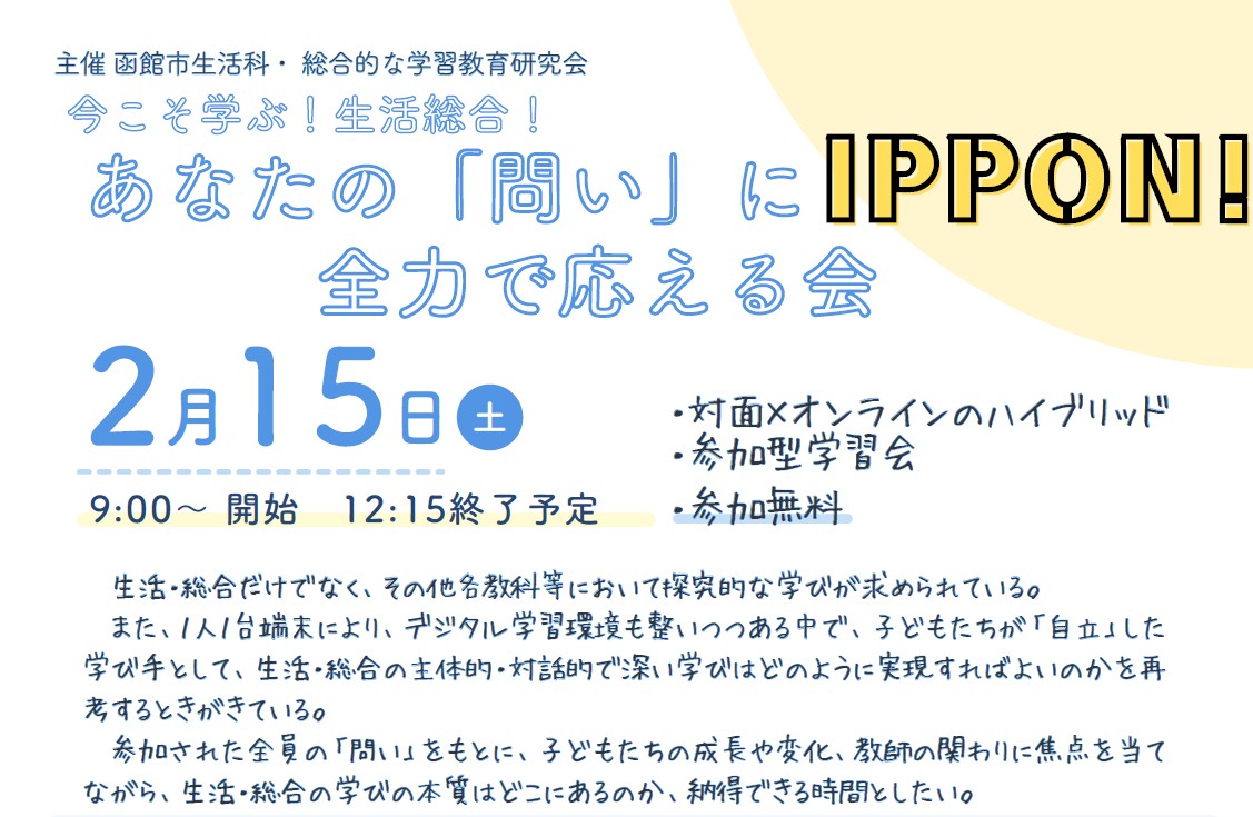 【研究会】函館地区主催「R7冬季研究会」(07/02/15) 2025年1月14日2025年2月22日 イベント ブログ 新着 研究会案内 ※終了しました この度、R7 2月15日(土)9:00より冬季研究会を開催いたします。北海道教育大学附属函館小学校を会場といたしましてオンライン併用で開催する予定です。詳しくはこちらへ!