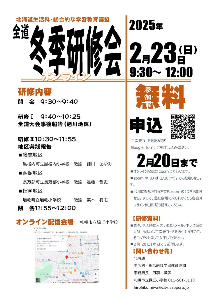 【ご案内】全道冬季研修会を開催します(07/02/23 オンライン) 2025年2月4日 イベント ブログ 新着 令和6年度の全道冬季研修会を、北海道生活科・総合的な学習教育連盟事務局の主管で開催します。令和7年2月23日(日)9時30分~12時00分会場:Zoomによるオンライン配信 ■詳しくはこちらから