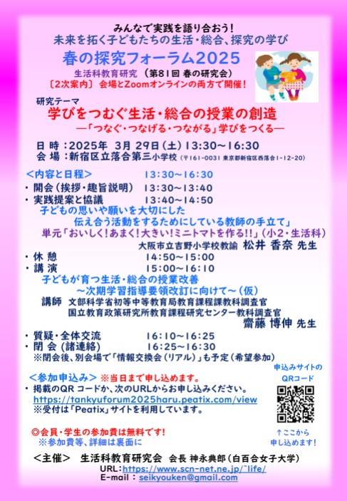 生活科教育研究会主催「第81回 春の研究会(ハイブリッド開催)」のご案内。