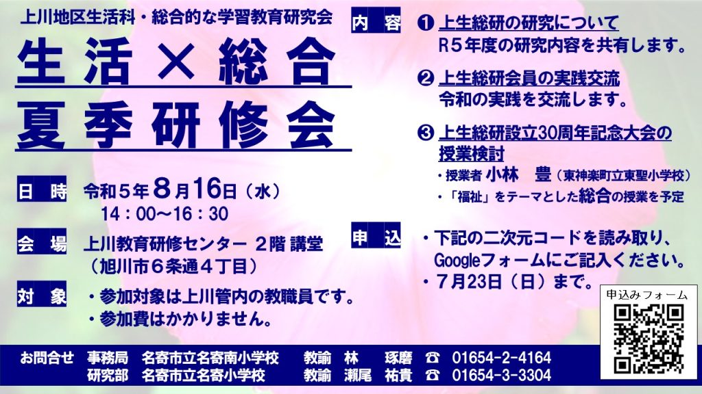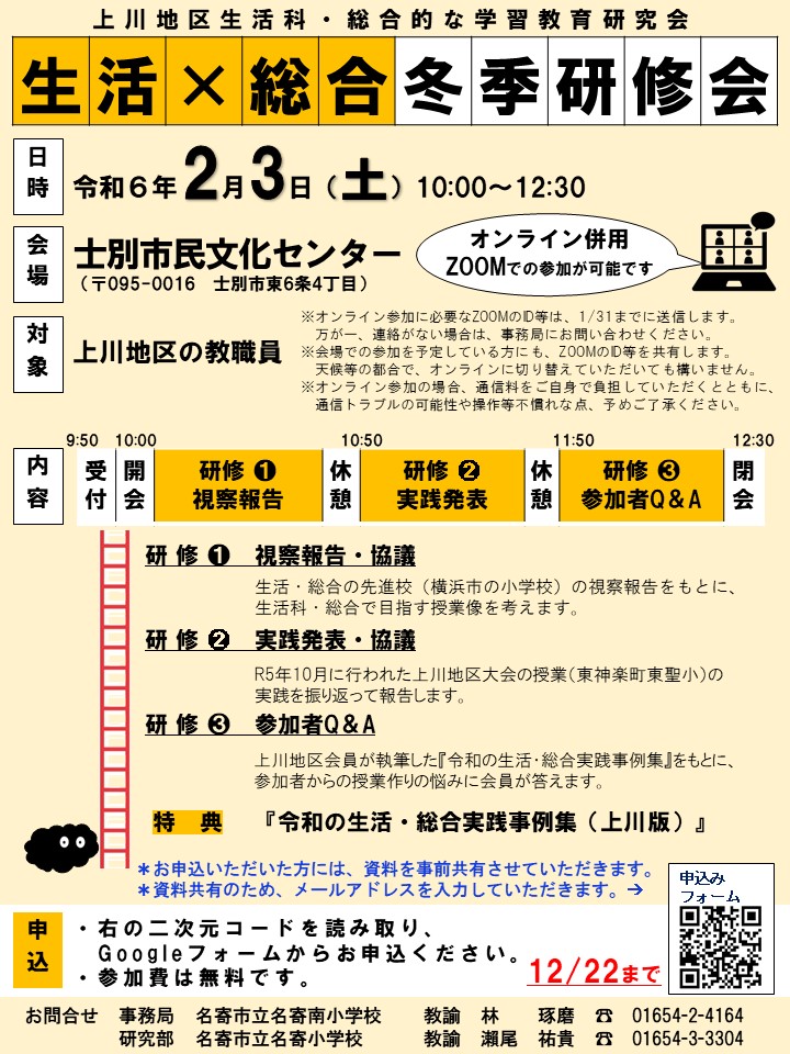 これまで上川地区を中心に実施してきた学習会を、地域を越え、より多くの先生方と一緒に学び合える場に!上川地区のみならず他地区の先生方も、関心があれば気軽にご参加ください。