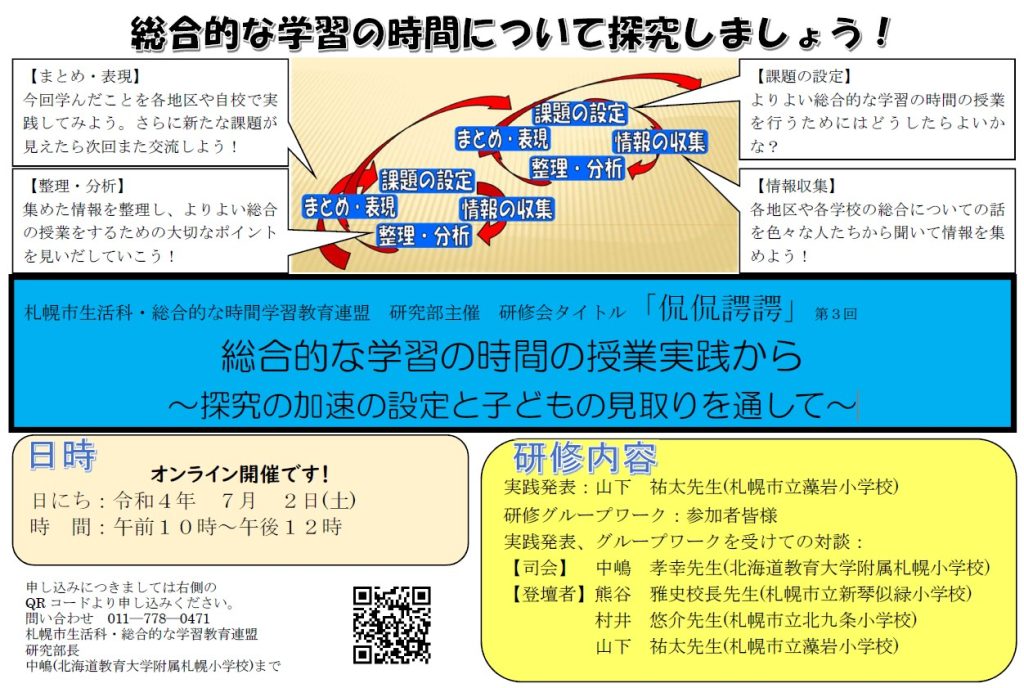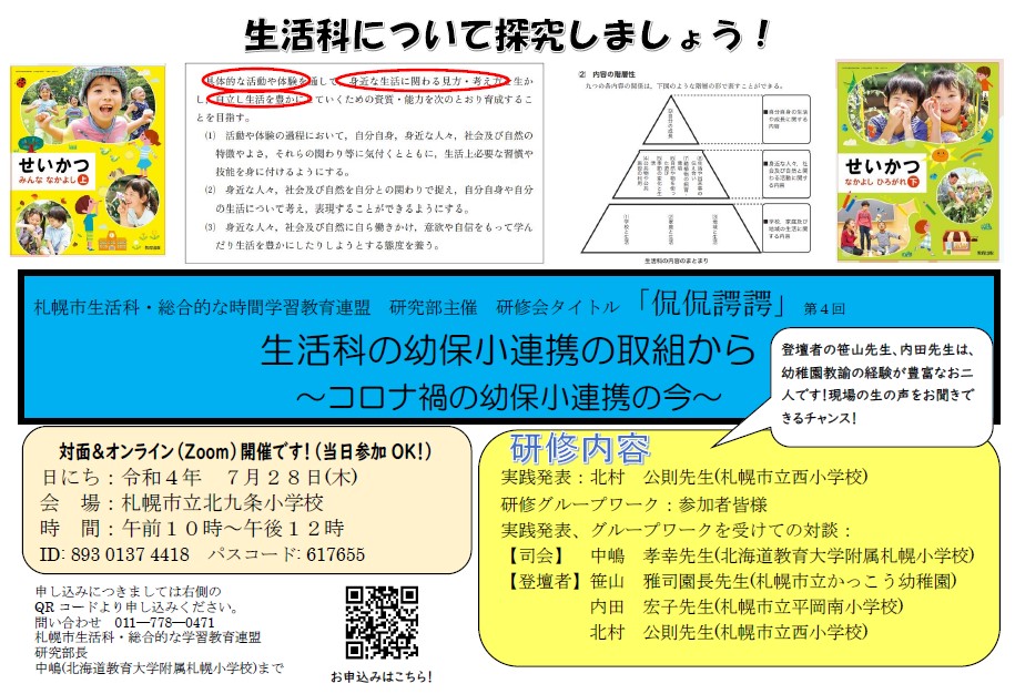 教科用図書の採択替えに伴い、札幌市では「小学校 教育課程編成の手引」が作成され、この4 月から学校現場でも大いに活用されています。そこで、今回の手引作成協力者として 実際に編集に携わった先生方を招聘し、「生活科編」ならびに「総合的な学習の時間編」の効果的な手引活用術について、具体的に解説いただく学習会を企画しました!GWも明け、生活・総合の本格的な学習活動がスタートする今、子どもたちの学びの可能性を一層拡げる単元づくりや、指導力・評価力の向上を目指して学んでみませんか?