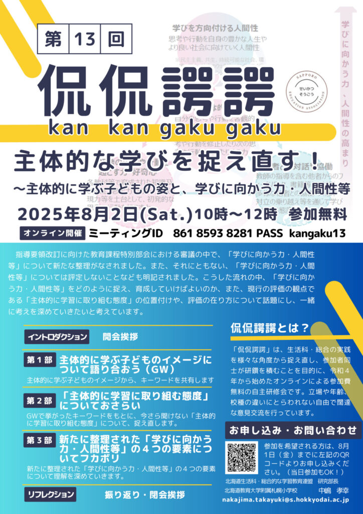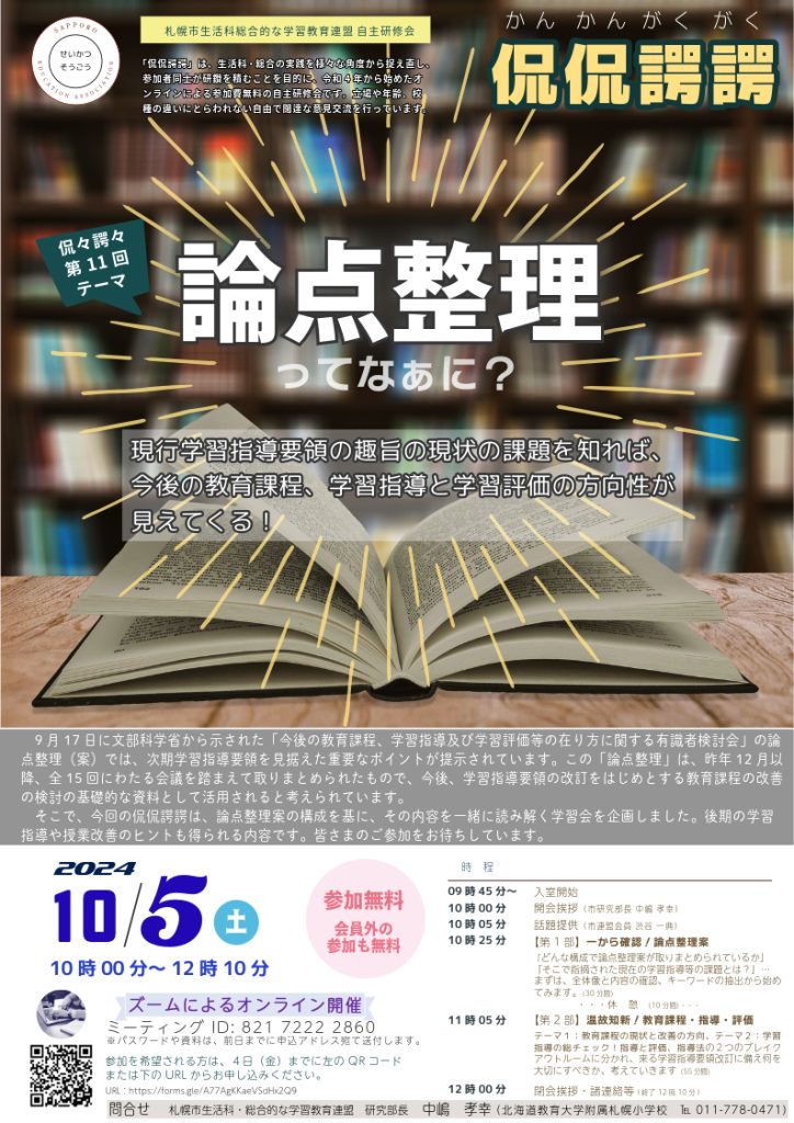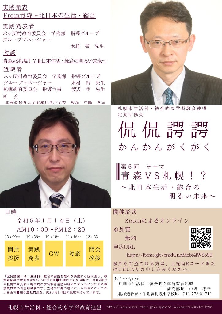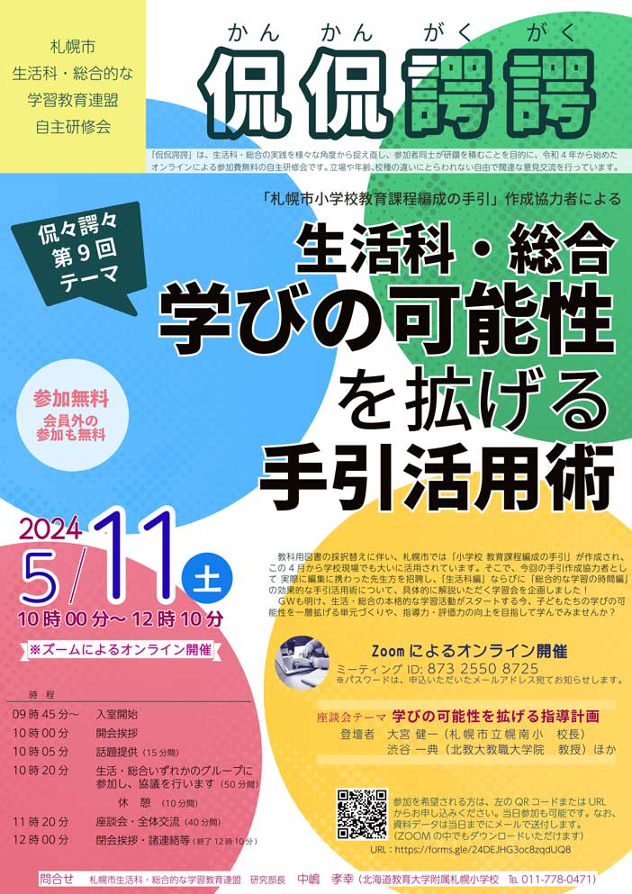 「侃侃諤諤(かんかんがくがく)」は、生活科・総合はもちろん、話題になっている教育界のキーワードなどについて様々な角度から捉え直し、参加者同士が研鑽を積むことを目的に、令和4年から始めたオンラインによる参加費無料の自主研修会です。立場や年齢、校種の違いにとらわれない自由で闊達な意見交流を行っています。