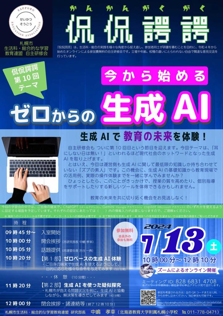 自主研修会も ついに第10 回目という節目を迎えます。今回テーマは、「耳にしない日は無い!」といわれるほど現代社会のホットワードとなった生成AI を取り上げます。とはいえ、今回は運営側も生成AI に関して最低限の知識しか持ち合わせていない「ズブの素人」です。この機会に、生成AI の基礎知識から教育現場での活用例、実際の操作体験までを一緒に学んでみませんか?