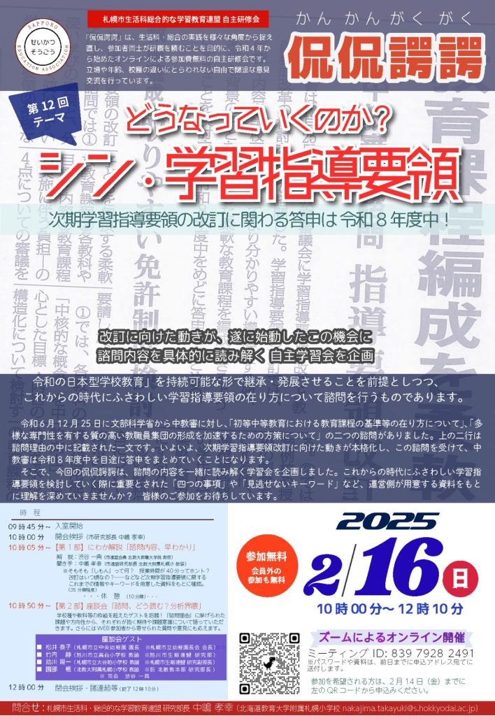 令和6月12月25日に文部科学省から中教審に対し、「初等中等教育における教育課程の基準等の在り方について」、「多様な専門性を有する質の高い教職員集団の形成を加速するための方策について」の二つの諮問がありました。いよいよ、次期学習指導要領改訂に向けた動きが本格化、この諮問を受けて中教審は令和8年度中を目途に答申をまとめていくことになります。そこで、今回の侃侃諤諤は、諮問の内容を一緒に読み解く学習会を企画しました。これからの時代にふさわしい学習指導要領を検討していく際に重要とされた「四つの事項」や「見逃せないキーワード」など、運営側が用意する資料をもとに理解を深めましょう!