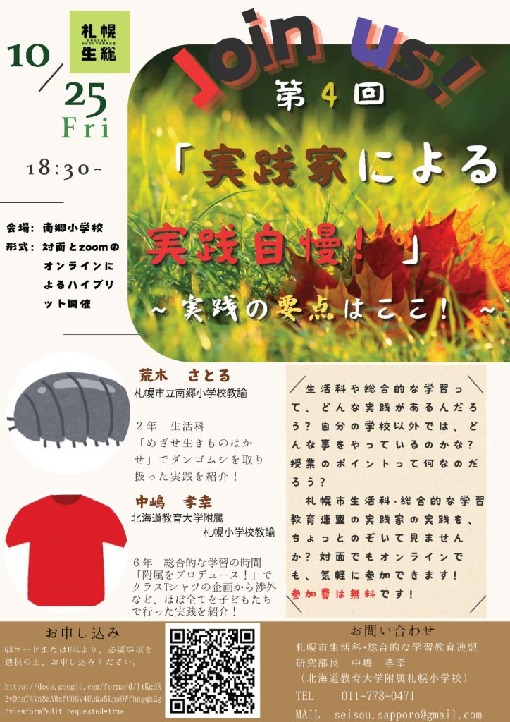 生活科や総合的な学習って、どんな実践があるんだろう? 自分の学校以外では、どんな事をやっているのかな?授業のポイントって何なのだろう?札幌市生活科• 総合的な学習教育連盟の実践家の実践を、ちょっとのぞいて見ませんか?